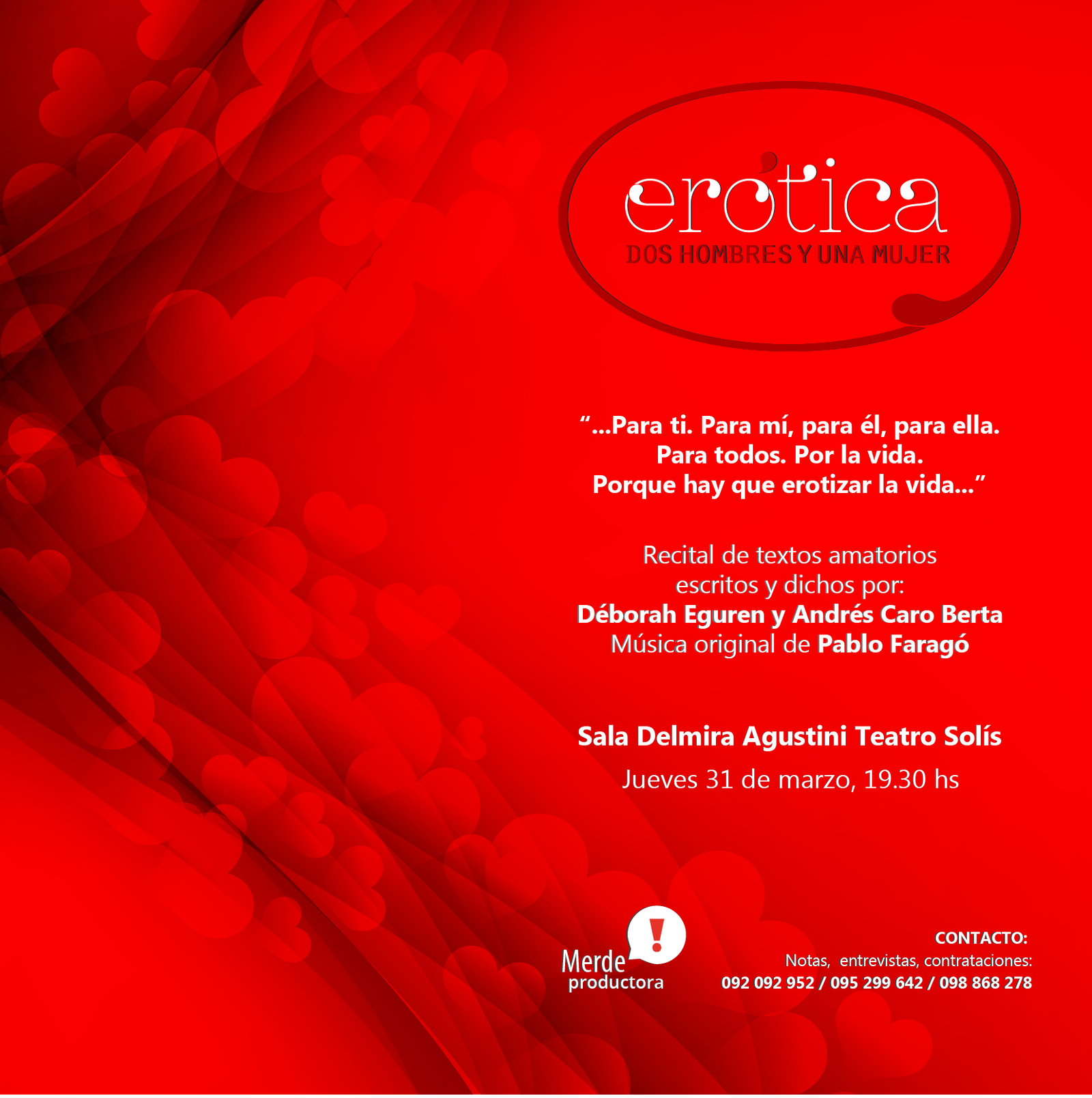 Cuenta regresiva para dicho estreno, recital con textos escritos y dichos por Déborah Eguren y Andrés Caro Berta, con la música original de Pablo Faragó.