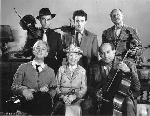 Buscando pasar desapercibidos, inventa el profesor que sus compiches son integrantes de un quinteto de cuerdas que debe ensayar allí. De esta forma, y para engañar a la mujer mientras elaboran el plan y esperan concretarlo, ponen un disco con música de cámara en el altillo donde se reúnen, para deleite de la anciana que cree que lo de la música es verdad