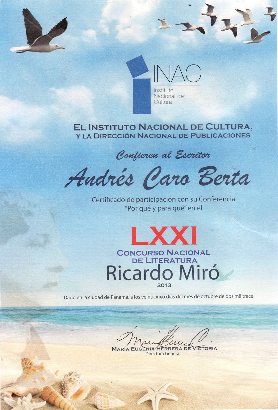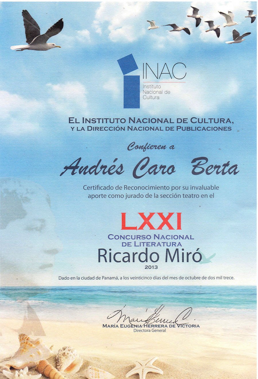 En octubre de 2013, Andrés Caro Berta fue nombrado Jurado Internacional en el rubro Dramaturgia, por la Dirección Nacional de de Publicaciones del Instituto Nacional de Cultura de Panamá