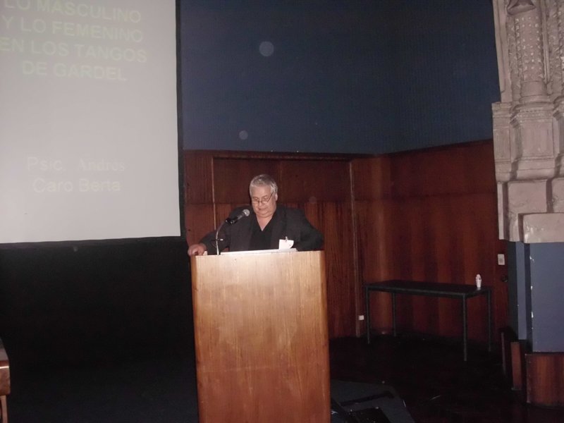 En el inicio el Psic. Caro Berta señala: “Habitualmente se entiende que el tango encierra en sus contenidos una actitud machista y de ataque a la mujer. Si bien eso es cierto en lo manifiesto, quizás, al final de esta conferencia podamos ver que en realidad en el contenido latente hay otras lecturas, dado que sus letras expresan un profundo dolor por el alejamiento de la mujer y una falta de autocrítica por los motivos que provocan esa situación