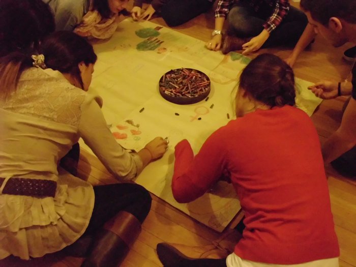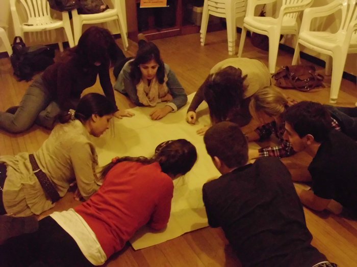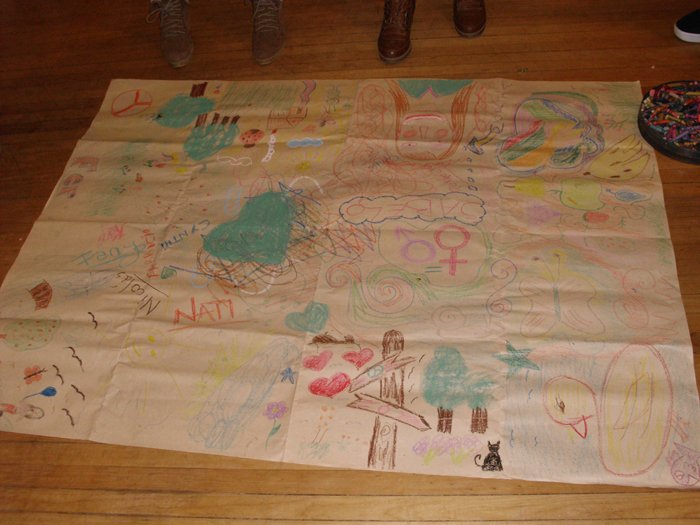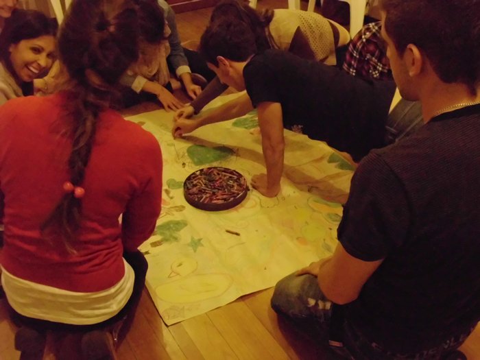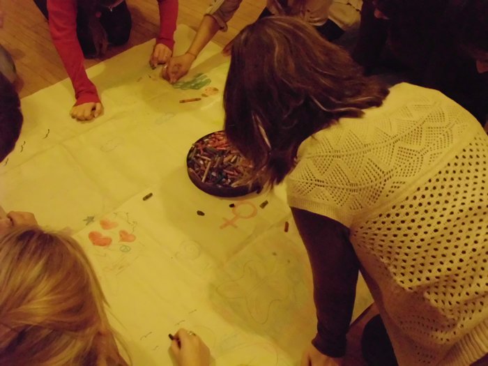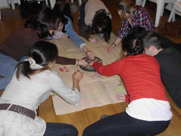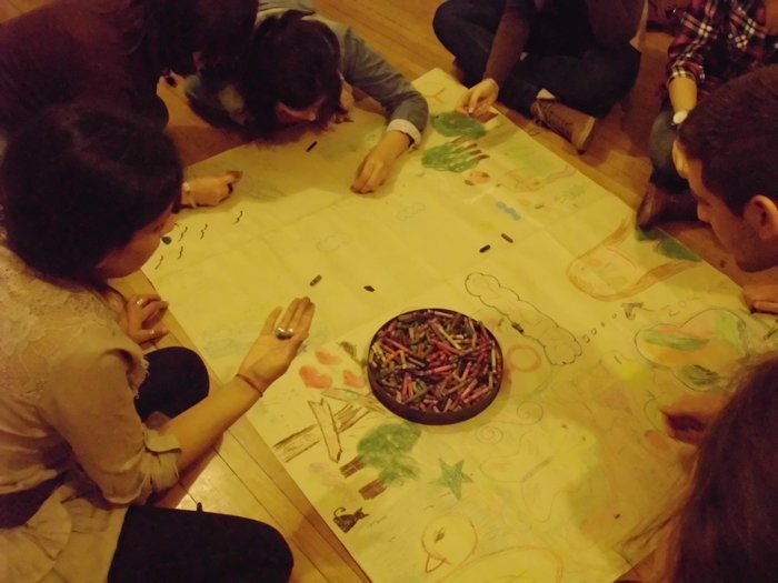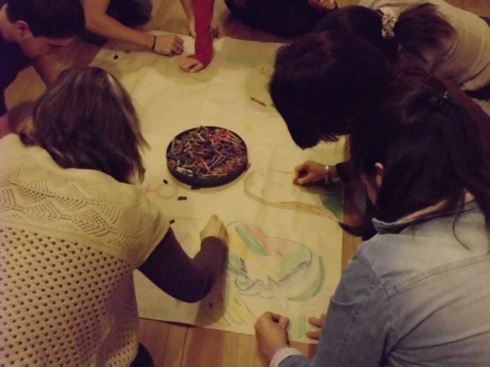 En una de las clases del curso que dicto en la Sociedad Uruguaya de Sexología, Psicoanálisis y Sexología. Teoría y técnicas de taller, parte del grupo realizó su primer trabajo en equipo consistente en dibujar sobre una superficie en forma conjunta. Lo más importante de dicha clase no fue el dibujo en sí, sino la emoción manifestada al final de la tarea por todos, el orgullo de lo realizado. Eso se nota en la necesidad de fotografíar lo hecho por los propios creadores.Lo cual me certifica la importancia de la creatividad, la expresión de emociones y sentimientos plasmados y expuestos para una mejor salud y un mejor relacionamiento con los demás.
