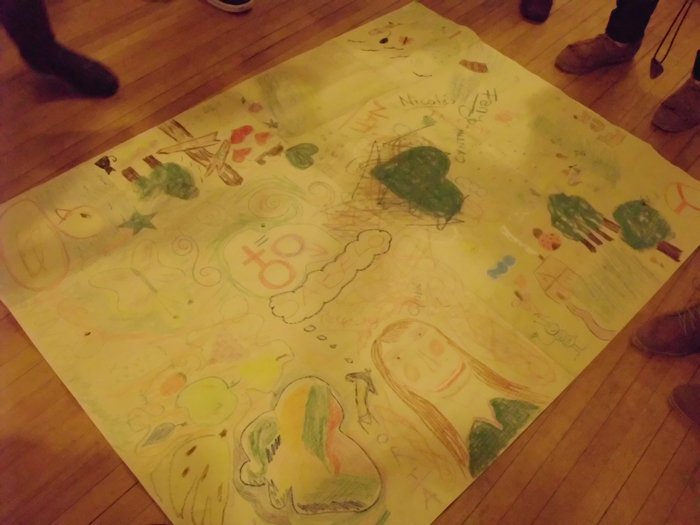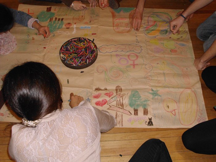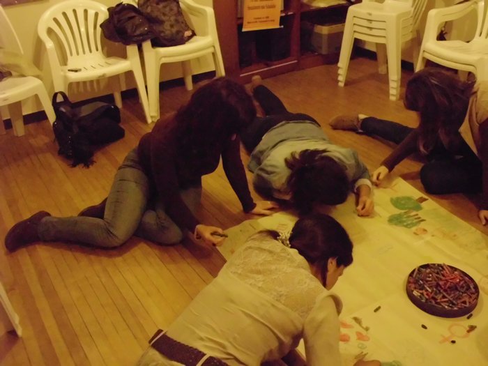 En una de las clases del curso que dicto en la Sociedad Uruguaya de Sexología, Psicoanálisis y Sexología. Teoría y técnicas de taller, parte del grupo realizó su primer trabajo en equipo consistente en dibujar sobre una superficie en forma conjunta. Lo más importante de dicha clase no fue el dibujo en sí, sino la emoción manifestada al final de la tarea por todos, el orgullo de lo realizado. Eso se nota en la necesidad de fotografíar lo hecho por los propios creadores.Lo cual me certifica la importancia de la creatividad, la expresión de emociones y sentimientos plasmados y expuestos para una mejor salud y un mejor relacionamiento con los demás.